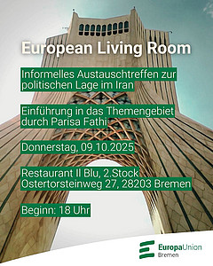 Die Europa Union Bremen hat im letzten Jahr ein neues Format ins Leben gerufen. Neben den öffentlichen Veranstaltungen machen wir nun auch einen European Living Room, um direkt miteinander ins Gespräch zu kommen. Am 9. Oktober führte Dr. Parisa Fathi, Deutsch-Iranerin, und Mitglied unseres Vorstands in die aktuelle Lage im Iran ein. » weiterlesen