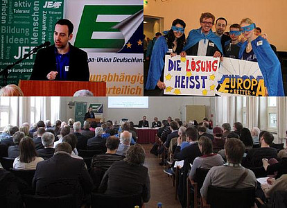 Nach der Eröffnung durch die BA-Vorsitzenden Franz Josef Klein (EUD) und Martin Luckert (JEF) begrüßten EUD-Präsident Rainer Wieland und JEF-Bundesvorsitzender Daniel Matteo die mehr als 100 angereisten Delegierten und Gäste. Rainer Wieland unterstrich die besondere Bedeutung der Europawahl 2014. Der diesjährige Wahlkampf führe dank der von den europäischen Parteifamilien gekürten Spitzenkandidaten zu anderen Debatten und werde sowohl Auswirkungen auf die innerparteiliche Demokratie, als auch auf die politische Kultur in Europa haben. Das Grußwort des JEF-Bundesvorsitzenden wurde mit einer Einlage der Opens external link in new windowEuroparetter gewürzt, einer Gruppe von JEFern, die in farbenfroher Verkleidung ihre Kampagne zur Europawahl präsentierten.