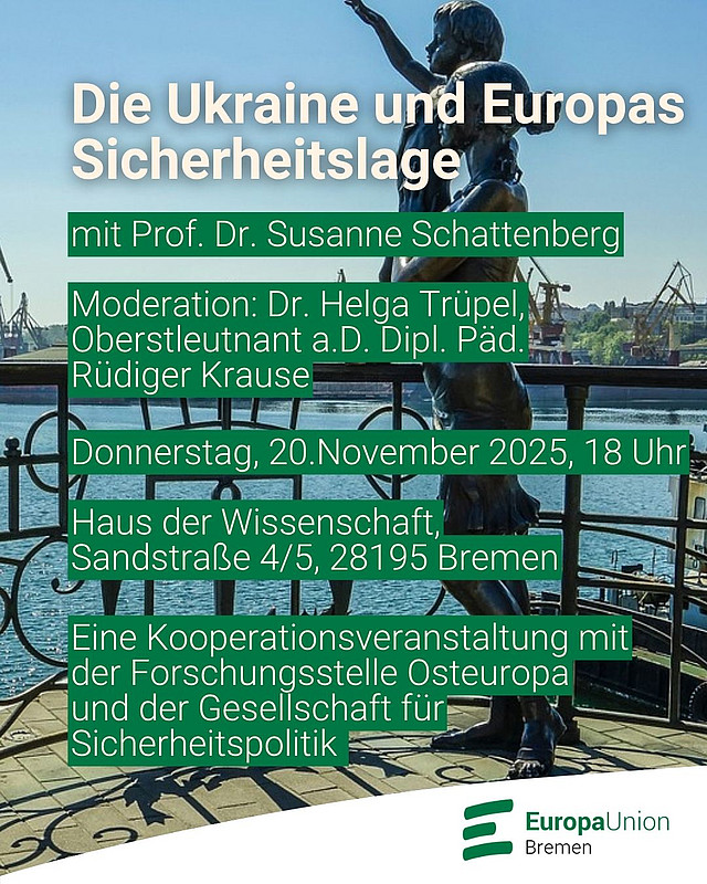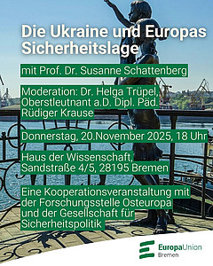Prof. Dr. Susanne Schattenberg von der Forschungsstelle Osteuropa wird den Abend mit einem Vortrag eröffnen. Moderiert wird die Veranstaltung von Dr. Helga Trüpel, der Vorsitzenden der Europa-Union Bremen, und Oberstleutnant a.D. Dipl. Päd. Rüdiger Krause, dem Leiter der Bremer Gesellschaft für Sicherheitspolitik.