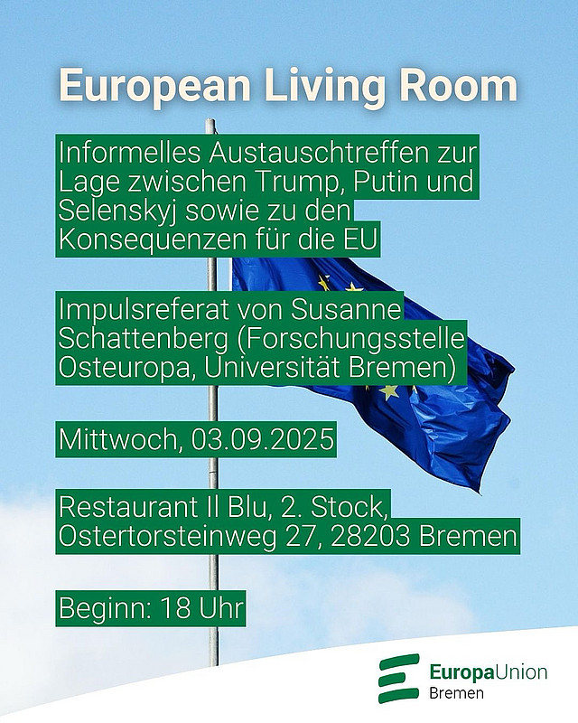 Im Rahmen des European Living Room laden wir zu einem offenen Austausch ein. Einen inhaltlichen Impuls gibt Susanne Schattenberg von der Forschungsstelle Osteuropa der Universität Bremen. Wir freuen uns auf euch!