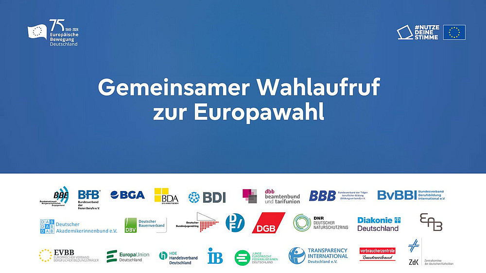 Wahlaufruf zur Europawahl 2024 der Europäischen Bewegung Deutschland e.V. gemeinsam mit BBE, BDA, BFB, BGA, BDI, dbb, BBB, BVBBI, DAB, DBV, DBJR, DF, DGB, DNR, EWDE, EAB, EVBB, EUD, HDE, IB, JEF, TI, vzbv, ZdK
